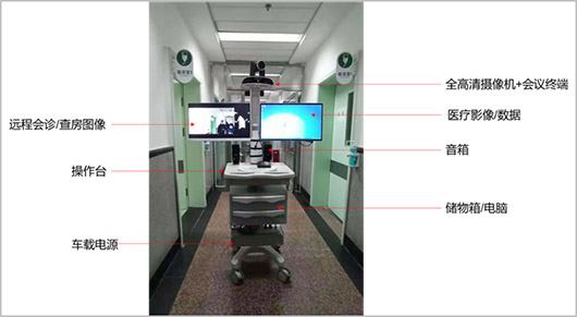 依據(jù)系統(tǒng)所配備的5G醫(yī)療會診/查房推車,可以實現(xiàn)視頻監(jiān)護、遠程會診、視頻查房及遠程探視等功能。